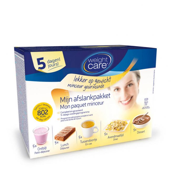 5-Daagse minikuur van Weight Care is één compleet pakket met alles wat je nodig hebt om gewicht te verliezen. In het pakket vind je vijf dagmenu's van elk 810 calorieën (kcal). Daarin zitten alle essentiële voedingstoffen die je dagelijks nodig hebt. Je hoeft dus nergens meer naar om te kijken, lekker makkelijk!