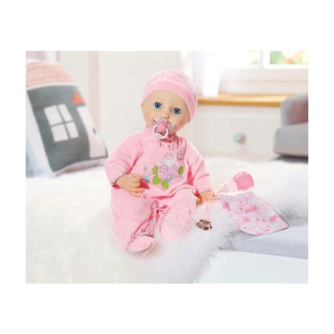 Het is een meisje... en haar naam is Baby Annabell. Baby Annabell lijkt wel een echte baby met alles wat ze kan. Ze reageert op aanraking, weent met echte tranen en is gek op haar flesje. Zo een kleine baby moet natuurlijk veel slapen. Als je Baby Annabell zachtjes heen en weer wiegt op je arm of in haar wieg, sluit ze haar ogen en slaapt ze al snel in met tevreden snurkjes! Als ze weer wakker wordt, heeft ze al weer honger. Dit schattige kleine meisje beweegt haar mond en ogen tijdens het zuigen - net als een echte baby! Als je over Baby Annabell's wang aait, hoor je allerlei brabbelende, vrolijke geluidjes. Weent ze toch eens echte tranen? Maak haar dan weer blij met het bij de set inbegrepen tutje. Baby Annabell heeft nog iets geleerd: ze kan nu in haar pamper plassen!