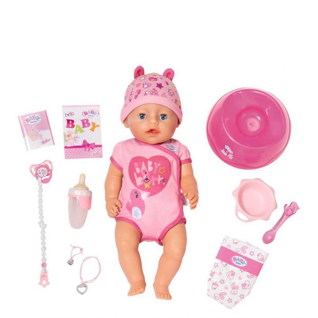 BABY born eet dolgraag haar babyhapje van haar bordje met een lepel, en haar favoriete drankje is water uit haar flesje. Als ze verdrietig is, huilt ze echte poppentranen wanneer je haar zachte bovenlijfje indrukt. Misschien huilt ze omdat ze naar de wc moet? Als je op de nieuwe zachte buikknop drukt, doet ze een plasje. Ze doet zelfs een grote boodschap met de druk op een knop. Het kleine waterratje spettert en spattert dolgraag rond in het bad. Zodra ze zichzelf moe heeft gemaakt, sluit ze haar blauwe ogen om te gaan slapen als je haar op haar rug legt - het is helemaal leuk als ze ook nog haar duim in haar mond heeft natuurlijk.