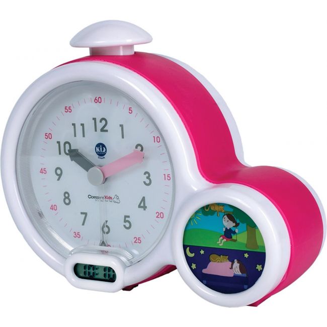 Wil jij je kindje de klok leren lezen en zorgen dat het weet wanneer het tijd is om uit bed te komen? De Kid’Sleep is een slaaptrainer en klok in één! Het werkt heel eenvoudig: naast de klok zitten 2 plaatjes, één van een kind dat buiten speelt en één van een kind dat ligt te slapen. Achter één van de plaatjes brandt een lampje. Als je kind wakker wordt, hoeft hij/zij alleen maar naar de vrolijke wekker te kijken welk plaatje verlicht is. Is het slapende kindje verlicht? Dan is het nog geen tijd om op te staan. Is het kindje dat buiten speelt verlicht? Dan mag je kindje uit bed. De klok heeft een analoge klok (met wijzers) en een digitale klok, zodat je kind op alle manieren de tijd leert lezen. De klok is tevens als wekker te gebruiken, waarbij gekozen kan worden uit drie weksignalen: een trein, een koekoek of vogelgezang. Hij heeft één knop om te ‘snoozen’ en om de klok te verlichten.