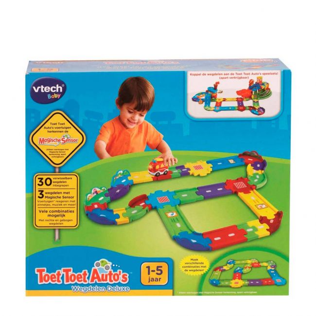 Luxe wegdelenset voor eindeloos speelplezier! Met 30 speelstukken. Met meerdere Magische Sensors die worden herkend door de Toet Toet Auto's voertuigen. De baan is makkelijk verwisselbaar en is in allerlei vormen te maken.
