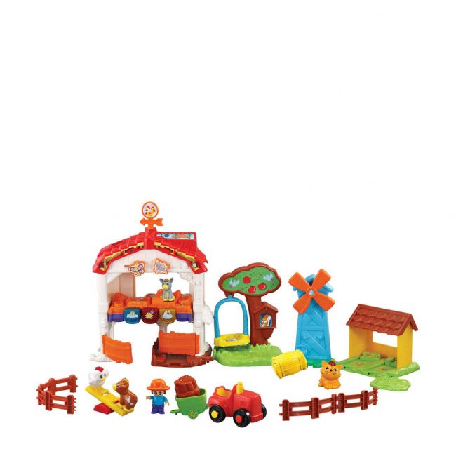 Druk op de knipperende toetsen om kennis te maken met dagelijkse bezigheden en klusjes op de boerderij. Plaats de boerin en de dieren op de PlayZone-locaties om vrolijke zinnetjes, dierenweetjes, grappige geluiden en melodietjes te horen. Gebruik de douchekop om de dieren te wassen. Laat de dieren spelen op de schommel en de wip of laat de boerin ze meenemen in de kar achter de tractor voor een ritje door de wei! Alle dieren groot en klein zijn welkom op de boerderij!