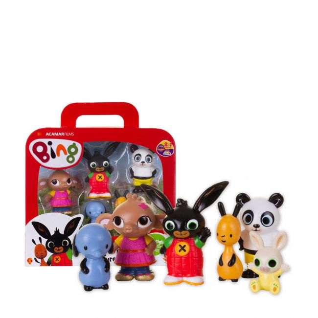Kijk jij ook altijd naar de avonturen van Bing en zijn vriendjes? Speel nu met alle figuurtjes uit deze populaire animatieserie! Deze schattige Bing figuurtjes hebben de juiste maat voor kleine handjes om mee te spelen. Bing fans zullen urenlang speelplezier beleven en alle avonturen naspelen. Neem Bing, Flop, Sula, Pando, Charlie en Amma overal mee naartoe in de handige koffer. De figuurtjes hebben een hoogte van 5 tot 9 cm. Leeftijdsindicatie: 18 maanden+