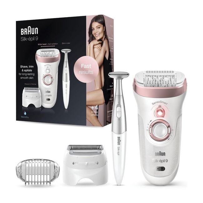 Silk-épil 9, met een brede kop voor een snellere epilatie en ultrasnelle resultaten. Hij heeft extra opzetstukken voor het scheren, trimmen en epileren voor een huid die weken glad blijft, en niet slechts enkele dagen.