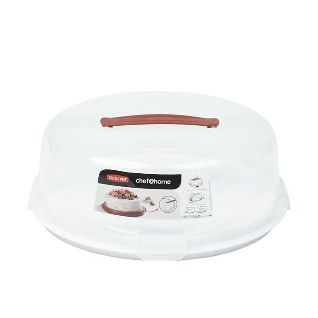 "De Curver taartdoos maakt onderdeel uit van de Chef@home-assortiment. Door zijn transparante deksel is de inhoud van deze taartdoos altijd zichtbaar. Mede door zijn rubberen handgreep is het comfortabel om de taartdoos op te pakken en zorgvuldig te verplaatsen. Het plateau is tevens een hulp bij het snijden van de taart (12 of 24 stuks).