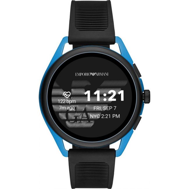 Emporio Armani Connected introduceert de nieuwe generatie van de veelzijdige Matteo touchscreen smartwatch. Deze Gen 5 smartwatch is alles wat je van Emporio Armani mag verwachten: technologische functionaliteiten omhuld in een stylisch design. De aluminium kast in het zwart en blauw bevat een verwisselbare touchscreen wijzerplaat die je kan personaliseren. Ook de sportieve zwarte synthetisch rubberen band is te personaliseren. Mix en match naar jouw smaak. Naast het stylisch design is de Matteo uitgerust met alle voordelen van de hedendaagse technologie. Meet je hartslag, volg je route via GPS en tel je stappen. Je kan zelfs een duik in het zwembad nemen, omdat de Matteo Swimproof is. De smartwatch is niet alleen een toevoeging aan je sportieve leven, maar ook aan je sociale leven. De smartwatch connect je eenvoudig met je smartphone (Android™ en iOS®) met het Wear OS By Google™ besturingssysteem. Zo ontvang je notificaties als inkomende oproepen, Whatsapp berichtjes en van je favoriete social media apps. Na al dit intensieve gebruik laad je de smartwatch weer binnen 1 uur tot 80% op. Ten opzichte van de generatie 4 Matteo is er nu twee keer zoveel opslaggeheugen. Dit is maar liefst 8GB om bijvoorbeeld al je favoriete Google Play apps te downloaden. De Matteo heeft nu ook een speaker waardoor je makkelijk met Google Assistant kan communiceren en met behulp van je Smartphone ook bellen (tot najaar 2019 alleen voor Android™ telefoons). Zelfs met al deze nieuwe features gaat de batterij van de Matteo nog langer mee door de gloednieuwe energiezuinige Qualcomm® Snapdragon WearTM 3100 processor.
