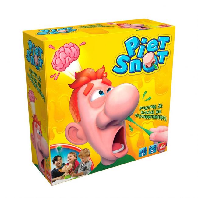 Bij Piet Snot gaat het er om, om niet de verkeerde snottebel te pakken, want dan gaat het mis! Stop eerst de hersenen in het hoofd van Piet, daarna verbind je de snottebel met de lus aan de haak in zijn neus en stop je de rest van de snottebellen erbij in. Nu rolt de eerste dobbelsteen een van de mogelijkheden: 1 pakken, 2 pakken, beurt overslaan of speelrichting omdraaien. Pak je de snottbel die aan de haak vastzit, dan springen zijn hersenen uit zijn hoofd en ben jij af! Blijf jij als laatste over?