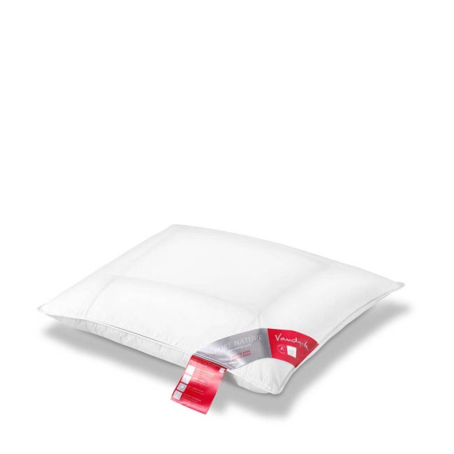 Dit Comfort kussen met rood label van Vandyck heeft een zacht middendeel en stevige rand. De kern van het Comfort kussen is gevuld met 65% ganzendons en 35% ganzenveertjes. De rand is gevuld met 85% ganzenveertjes en 15% ganzendons. De kern is zacht, de rand van ganzenveertjes is stevig. De tijk is gemaakt van 100% fijne gekamde katoen.