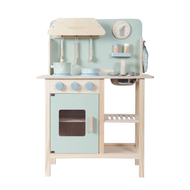 Het Little Dutch keukentje van hout past in iedere woonkamer of speelhoek en is voor elk kind ideaal om mee te spelen. De speelkeuken bestaat uit een oven met deur, een opbergplank, een spoelbak met kraan, een klok en een gasfornuis met twee kookplaatjes. Je kind kan gelijk aan de slag met het passende keukengerei, pannen, ovenwant en een peper en zout stel. De draaiknoppen van het gasfornuis en de oven maken klikgeluiden wanneer je eraan draait. Je kleine chef kan heerlijk bakken en braden in deze complete keuken van Little Dutch. Wordt geleverd met extra verhogers (6 cm) die je onder de poten van de keuken schuift, zodat de kleine chef er vele jaren kookplezier van kan beleven. De keuken zit ongemonteerd in de verpakking.