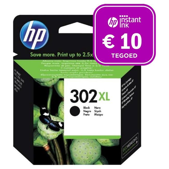 Vrijwel alle printers die gebruik maken van deze HP 302 inktcartridge, zijn ook geschikt voor HP Instant Ink! Onderin vind je een overzicht welke printers dit zijn. Je kunt je hier eenvoudig voor aanmelden en je krijgt ook meteen €10,- Instant Ink tegoed in je account. Achterop de verpakking is een info-sticker geplakt met alle informatie over dit cadeautje en wat je moet doen om er gebruik van te kunnen maken.