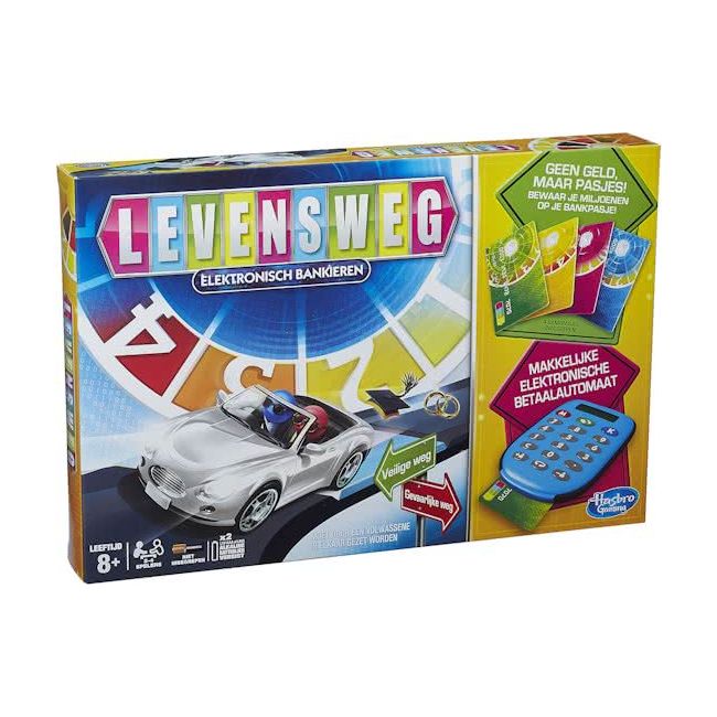 Bij Levensweg Elektronisch Bankieren gebruik je pasjes om te betalen. In deze moderne versie van het bekende spel Levensweg regel je alle geldzaken met de elektronische geldautomaat. Geen cash geld, maar bankpasjes dus!
