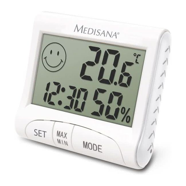 De 60079 HG digitale thermo- en hygrometer HG 100 meet nauwkeurig de luchtvochtigheid en kamertemperatuur in huis. Dit kleine maar slimme apparaat geeft in een oogopslag weer of de ruimtes te droog, te vochtig, te warm of te koud zijn. Kortom de HG 100 van Medisana zorgt voor een optimale leefomgeving. Hoe werkt de HG 100?Plaats de hygrometer op een centrale plek in huis en hij doet meteen zijn werk. Naast de weergave van kamertemperatuur en luchtvochtigheid bevat de HG 100 ook een comfort zone-indicator dmv een smiley geeft de hygrometer weer of de tempratuur en luchtvochtigheid gezond of ongezond is.De hygrometer is voorzien van een alarmfunctie en kan eenvoudig bevestigd worden dmv magneethouder of neerzet worden met behulp van voet.Specs: Weergave van luchtvochtigheid en kamertemperatuur voor een gezonde leefomgevingOpslag van hoogste en laagste waardesMeetbereik Temperatuur: -10°C ~ +50°C(+14° ~ +122 F°)Meetbereik luchtvochtigheid: 20% ~ 90%Comfort zone-indicator (dmv smiley op display)TijdweergaveAlarmfunctieDe thermometer kan eenvoudig bevestigdworden dmv magneethouder of neerzetworden met behulp van voet.