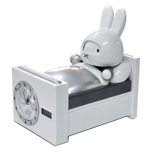 Bij het slapen gaan vertel je aan je kindje dat Nijntje ook gaat slapen. Hou de zilverkleurige balk op de rand van het bed ingedrukt gedurende 5 seconden totdat de ogen van Nijntje sluiten. Zeg dan: Pas als Nijntje haar oogjes opent, mag je uit bed. Mocht je kindje voortijds wakker worden dan ziet het dat Nijntje haar oogjes nog dicht heeft en weet dat het dan nog niet uit bed mag.