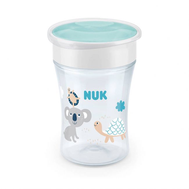 De NUK Magic Cup, de 360° beker waarmee jouw kindje eenvoudig zelf leert drinken. De beker heeft een oranje binnenkant en is lichtblauw aan de buitenkant, versierd met krabben die de Magic Cup helemaal af maken. De Magic Cup heeft een speciale drinkrand. Het werkt net als een gewoon glas, doordat het kind aan elke kant kan drinken. De drinkrand opent als het kind de beker aan de lippen zet en zuigt. De cup lekt niet als de beker valt en daarom handig om knoeien te voorkomen. De 3 delen van de cup zijn te reinigen in de vaatwasser.