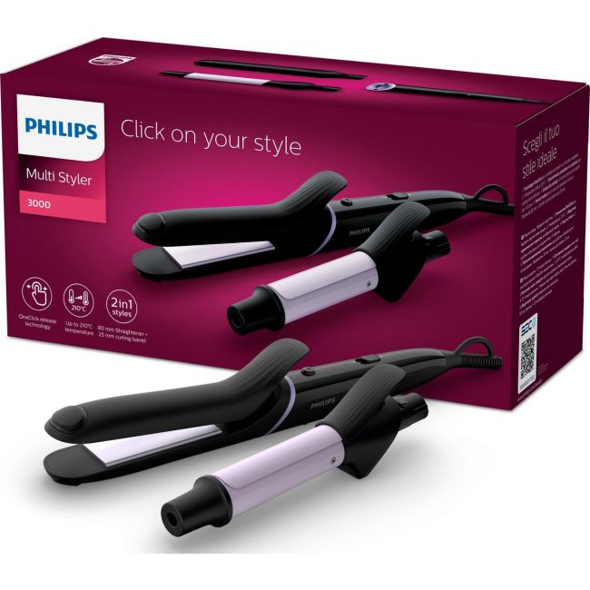 Geef jezelf elke dag een andere look met deze Philips StyleCare BHH811/00 - Multistyler. Vandaag stijl haar? Klik de straightner op de tang. Morgen liever krullen? In 2 klikken verwissel je de straightner voor de krultang. De multistyler heeft een eigen stijlgids met meer dan 10 verschillende stijlen om uit te kiezen en wordt geleverd met 2 handige haarelastieken en een haarlus om eenvoudiger te modelleren. De tang is binnen 60 seconden klaar voor gebruik en heeft een hoge temperatuur (tot 210 °C) voor een perfect resultaat. Het uiteinde van de styler blijft koel zodat je de styler tijdens het stylen veilig vast kunt houden zonder je vingers te verbranden. De beschermende keramische buitenlaag zorgt ervoor dat jouw haar niet beschadigt bij veelvuldig gebruik.