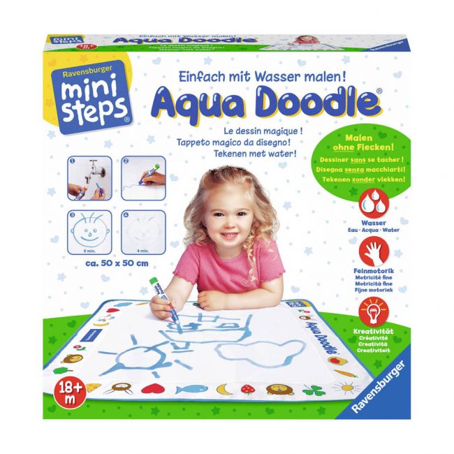 De allereerste tekeningen met Aqua Doodle® van Ravensburger. Onbekommerd tekenen zonder kans op geklieder en vlekken. Fantastisch! De stift vullen met leidingwater. Het water maakt blauwe lijnen op de tekenmat en ze verdwijnen als het water opdroogt. Het oefent de fijne motoriek en bevordert de concentratie en creativiteit.