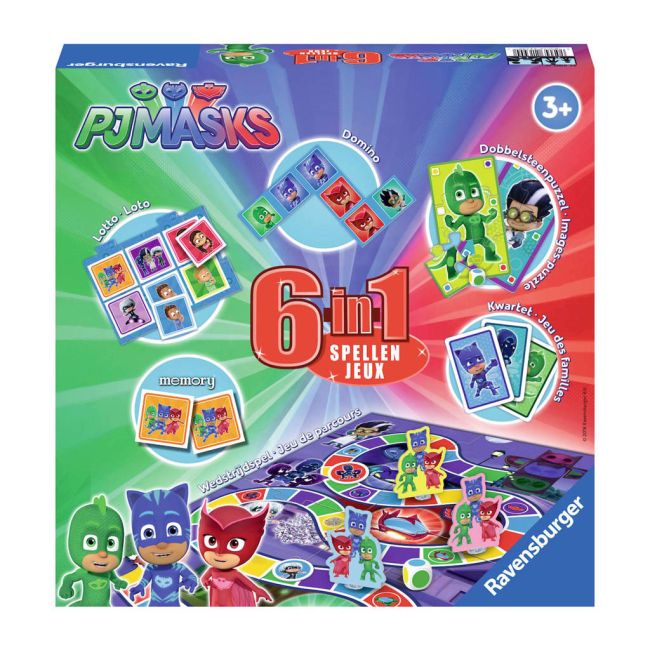 Met de PJ Masks figuren kunnen jullie 6 verschillende klassiekers spelen: memory, domino, lotto, kwartet, dobbelsteen puzzel en het wedstrijdspel „Ga mee naar het hoofdkwartier van PJ Masks“. Catboy, Owlette, Gekko en ook alle slechterikken doen mee met deze spellenverzameling en zorgen voor veel speelplezier!