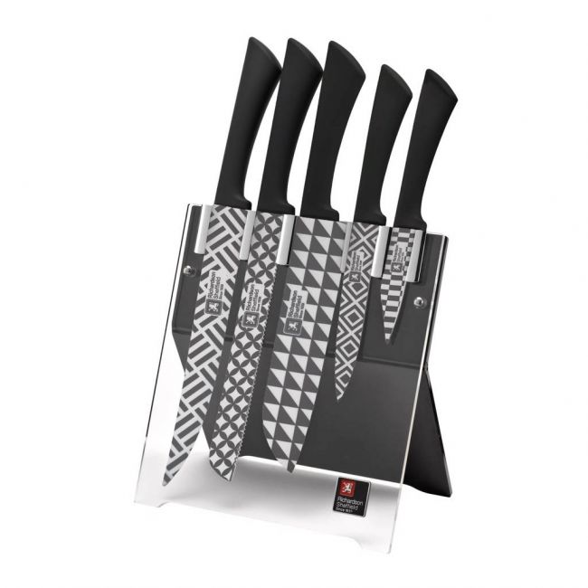 Dit 5-delige messenblok van Richardson Sheffield heeft een origineel design op het lemmet. De zwart-witte print komt in het doorzichtige messenblok goed tot zijn recht. Het lemmet heeft een non-stick coating wat ervoor zorgt dat voedsel niet aan de bladen blijft plakken, hierdoor zijn de messen fijn in gebruik en zijn deze eenvoudig schoon te maken. Het heft is gemaakt van zacht materiaal, zodat je een comfortabele grip op de messen hebt.