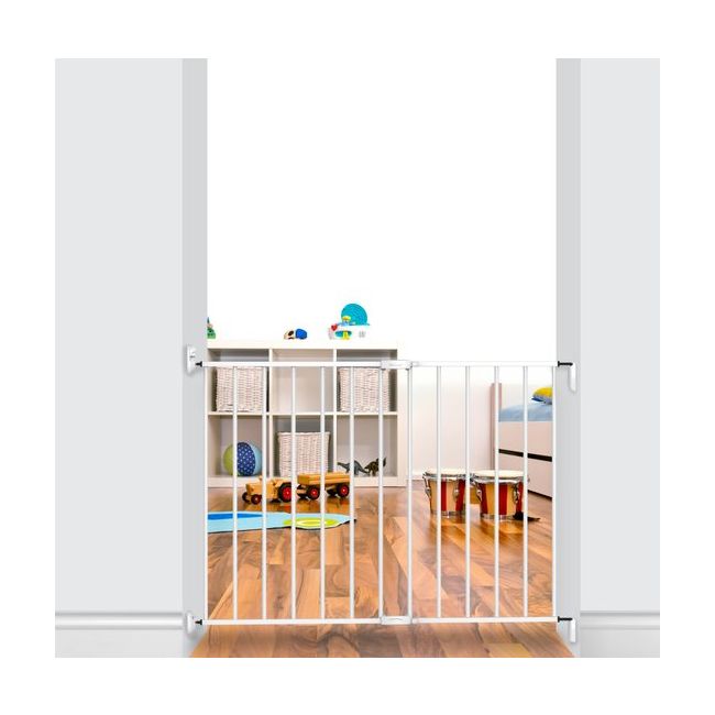 Zacht sluitingssysteem (soft close), dubbel sluit en open ingssysteem, schuift in en vergrendelt op kleine, muurbevestiging,snel verwijderbaar muurscharnier,optomaal afstelsysteem (OAS)met snelsluiting,boven en onder vergrendelpunten. Opent in beide richtingen voor deuropeningen en in een enkele richting voor trapopeningen. Past in openingen van min 62 cm tot max 102 cm. Direkte bevestiging op de muur, Dit veiligheidshek voldoet aan EN 1930:2011.