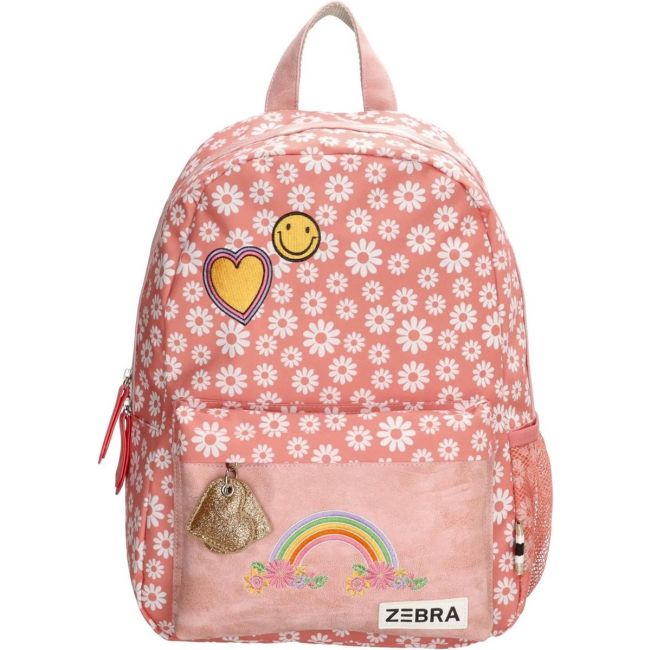 Een rugzak in een roze kleur met verschillende bloemen als print van het merk Zebra. Deze rugzak heeft een voor- en hoofdvak die beide sluiten met een rits. In het binnenvak zitten verschillende opbergvakjes. De schouderbanden zijn verstelbaar. Aan de rits zitten twee glitter hartjes en op het voorvak een regenboog!